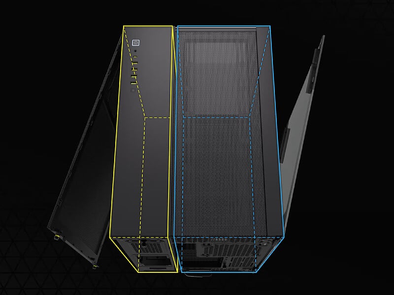 מארז ה-CORSAIR 6500X Mid-Tower Dual Chamber מספק זרימת אוויר וקירור יוצאי דופן עם פאנל רשת מלא ועיצוב תא כפול לבנייה מאורגנת ונקיה.