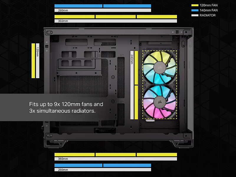 התאם אישית את מערך הקירור שלך עם מקום ל-9 מאווררים של 120 מ"מ או 6 מאווררים של 140 מ"מ, כולל אפשרויות הרכבה של רדיאטור בגודל של עד 240 מ"מ בצד, ועד 360 מ"מ בגג ובתחתית.