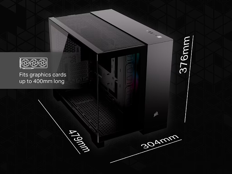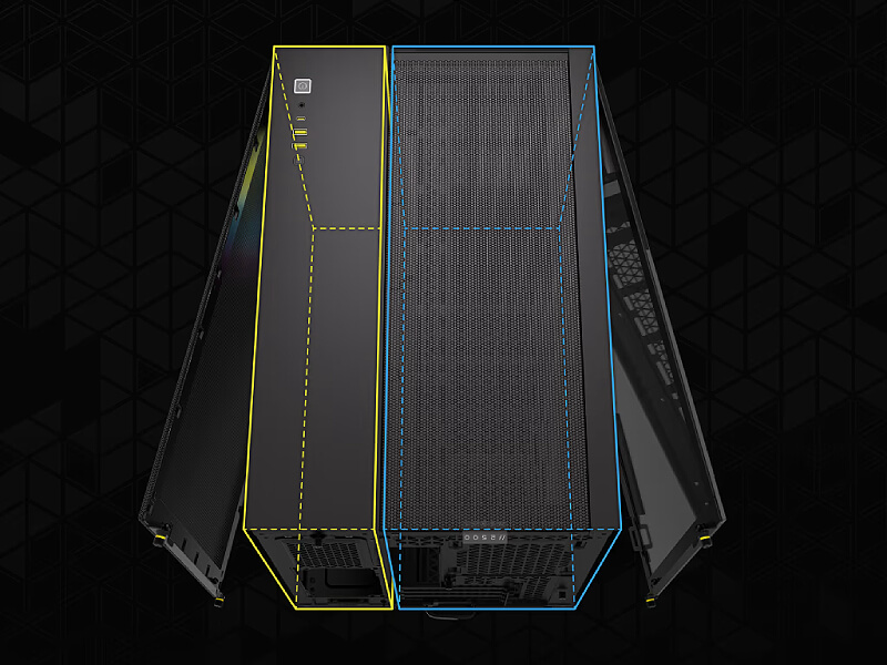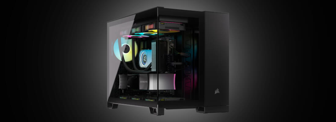 מארז ה-iCUE LINK 2500X RGB Mid-Tower Dual Chamber מבית CORSAIR מספק תצוגה מסודרת ונוחה של מחשב ה-SFF (Small Form Factor) שלך דרך לוחות זכוכית מחוסמת כפולה, עם שני מאווררי RX120 RGB מותקנים מראש.
