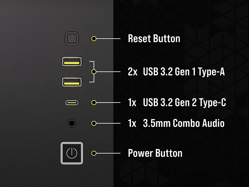כולל 2 יציאות USB Type-A 3.2 Gen 1, יציאת USB Type-C 3.2 Gen 2, וחיבור משולב אודיו ומיקרופון.