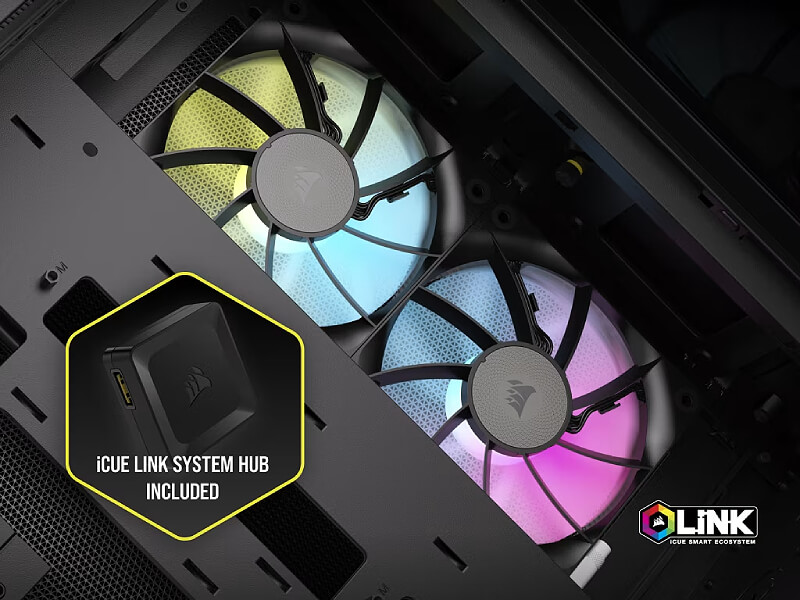 מגיע עם חבילת מאווררי iCUE LINK (2x מאווררי RX RGB ורכזת System Hub).