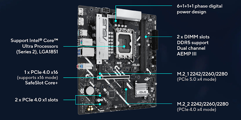 לוחות האם מסדרת ASUS PRIME מתוכננים במומחיות כדי לממש את מלוא הפוטנציאל של מעבדי Intel® Core™ Ultra העדכניים ביותר (סדרה 2).