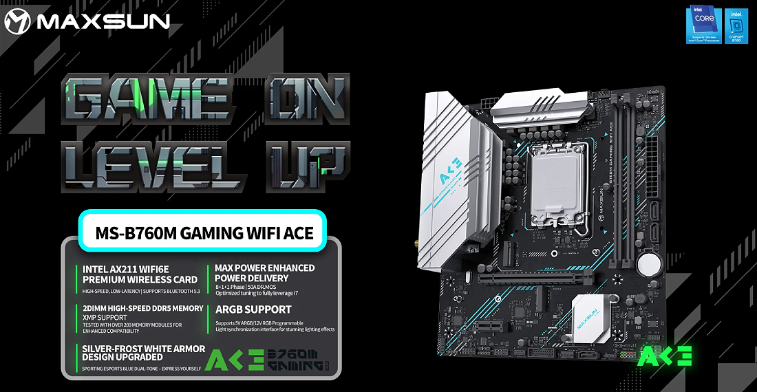 MAXSUN B760M GAMING WIFI ACE MS-B760MGAMINGWIFIACE. Intel AX211 WIFI6E Wireless Card. Max Power Enhanced Power Supply. High-Speed DDR5 Memory. ARGB Support.