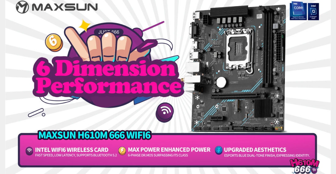 MAXSUN H610M 666 WiFi 6 MS-H610M666WIFI6. Intel WIFI6 Wireless Network Card. Bi-Color Screen Printing in Gaming Blue. 4+1+1 phase DR.MOS high specification power supply.