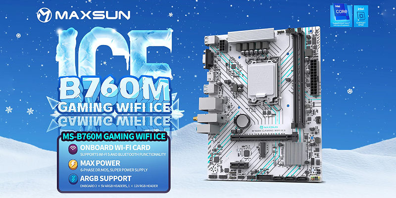 MAXSUN B760M GAMING WiFi ICE. Intel 12th/13th/14th Gen Ready Supports LGA1700 socket CPUs. MS-B760MGAMINGWIFIICE