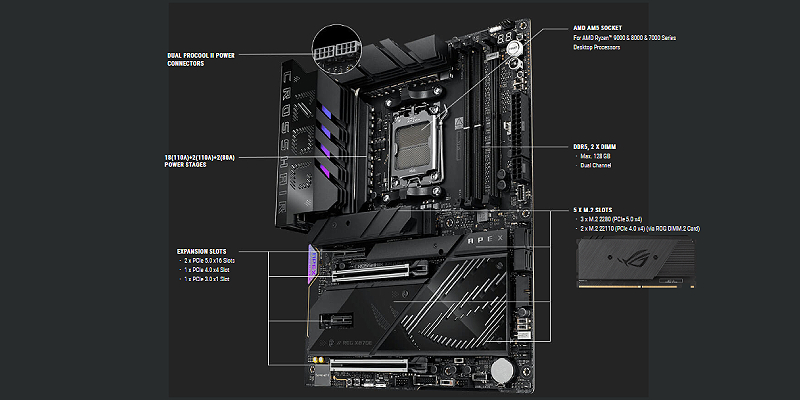 לוח האם ROG Crosshair X870E Apex, מוכן לעידן ה־AI PC, נבנה במיוחד לשבירת שיאי אוברקלוקינג – בזכות אפשרויות BIOS מתקדמות ומערכת קירור ייחודית הכוללת את ערכת המאוורר הבלעדית של ROG לזיכרון.
