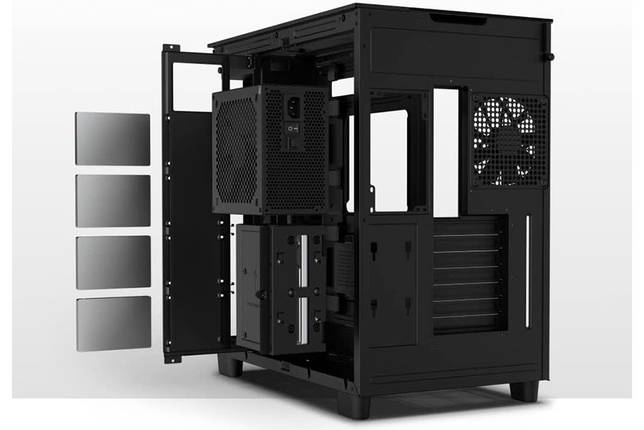 Spacious interior with intuitive cable management, a dedicated SSD wall panel, and removable top and side mounting brackets.