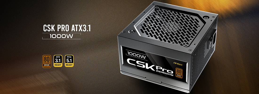 ספק כח Antec CSK Pro 1000W ATX3.1 80+ Bronze CSK1000PRO, ספק מתקדם עם תאימות ATX 3.1 ו-PCIe 5.1, עם אישור 80 PLUS BRONZE.