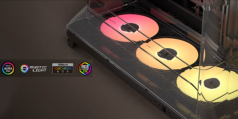3 מאווררי ARGB בגודל 120 מ״מ עם רוטור הפוך (Reverse) מותקנים מראש בתחתית המארז, מספקים קירור עוצמתי ושקט עם תאורת RGB מרהיבה.
