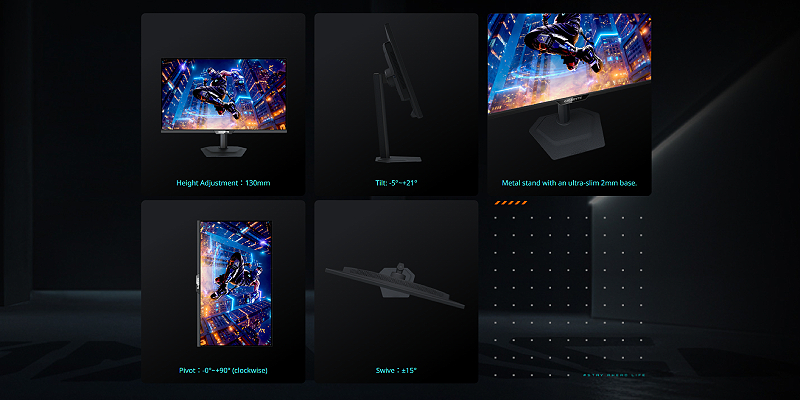 מסך הגיימינג של GIGABYTE מגיע עם מעמד בלעדי בעל עיצוב ארגונומי, המאפשר טווח רחב של כיווני גובה והטיה לנוחות מקסימלית.