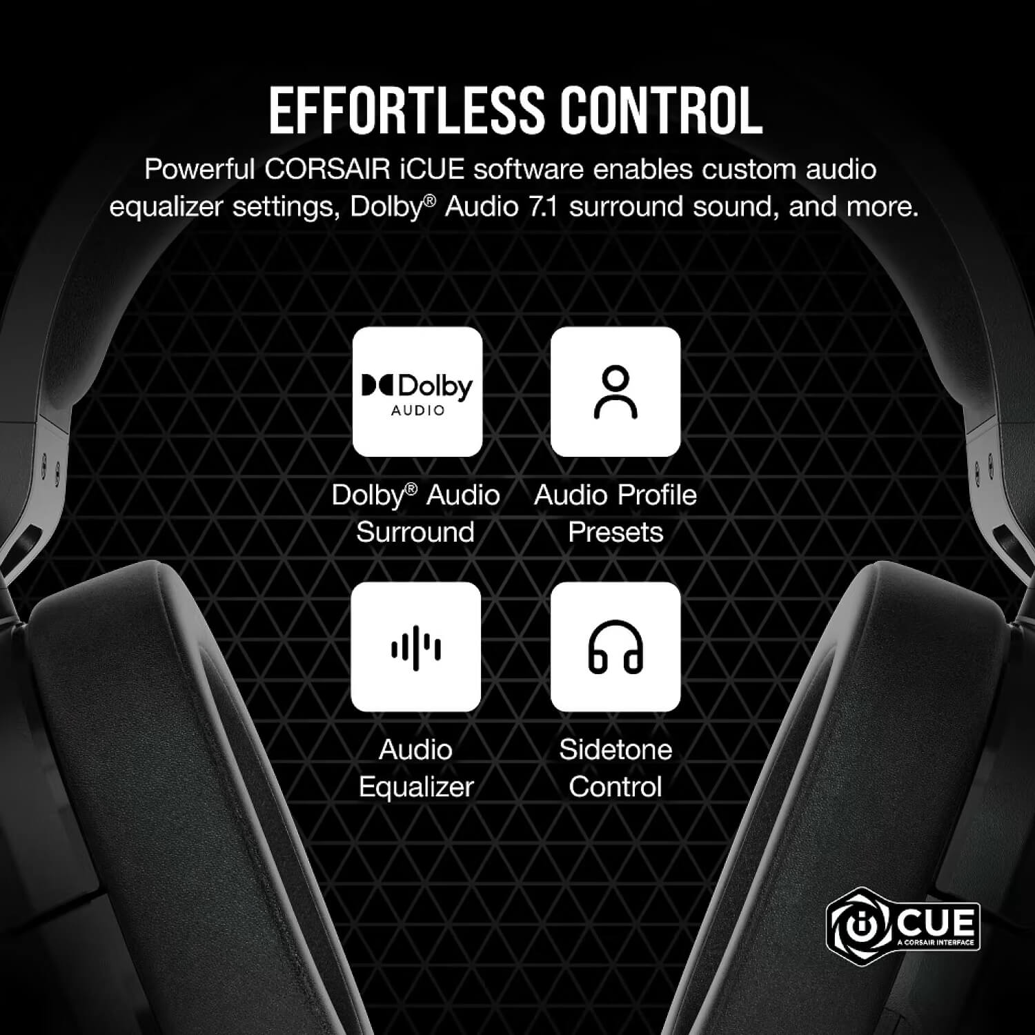 מתאם ה-USB הכלול מאפשר סאונד סראונד של Dolby Audio 7.1 וגישה לתכונות אחרות באמצעות תוכנת CORSAIR iCUE במחשב PC או Mac. לחלופין, שקע 3.5 מ"מ מתחבר בקלות למחשב, קונסולה או מכשירים ניידים אחרים.