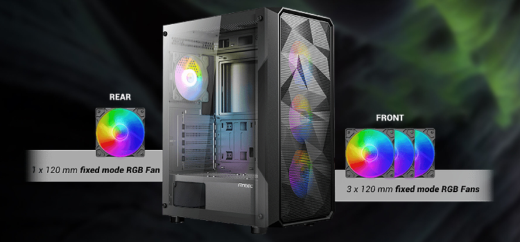 במארז מותקנים מראש 3 מאווררי RGB במצב קבוע בגודל 120 מ"מ מלפנים + מאוורר RGB במצב קבוע בגודל 120 מ"מ מאחור.