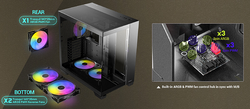 2 מאווררי ARGB PWM בגודל 160 מ"מ הפוכים + מאוורר ARGB PWM בגודל 140 מ"מ.