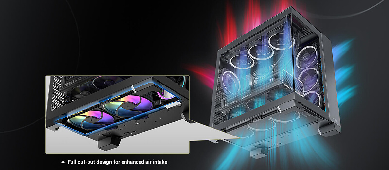 הצד העליון, התחתון והימני כולם תומכים ברדיאטורים עבים בגודל 360 מ"מ, המספקים יכולת קירור ויעילות.