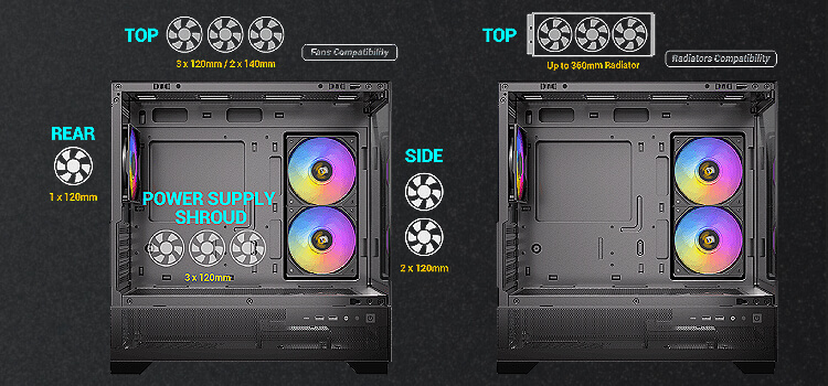 זרימת אוויר אנכית מלמטה למעלה באמצעות רשת בחלק הקדמי התחתון, השמאלי התחתון והצד הימני מאיצה את פיזור החום.