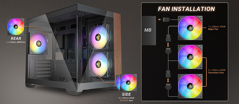 השתמש במאוורר המארז הראשי כדי לשרשר את שני המאווררים האחרים לסנכרון ARGB וליצור את הסגנון האישי שלך.
