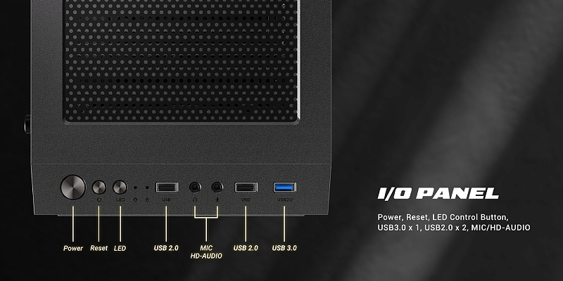 Power, Reset, LED Control Button, USB3.0 x 1, USB2.0 x 2, MIC/HD-AUDIO
