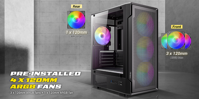3 מאווררי ARGB בגודל 120 מ"מ מלפנים + מאוורר ARGB אחד בגודל 120 מ"מ מאחור.
