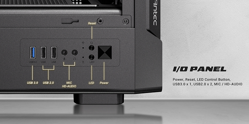 Power, Reset, LED Control Button, USB3.0 x 1, USB2.0 x 2, MIC / HD-AUDIO