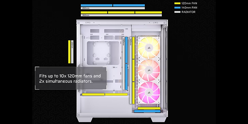 התאם אישית את מערך הקירור שלך עם מקום ל-10 מאווררים בגודל של עד 120 מ"מ, בתוספת אפשרויות מגוונות להרכבה של רדיאטור עד 360 מ"מ בצד ובגג.