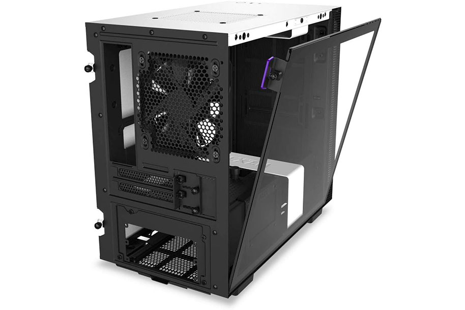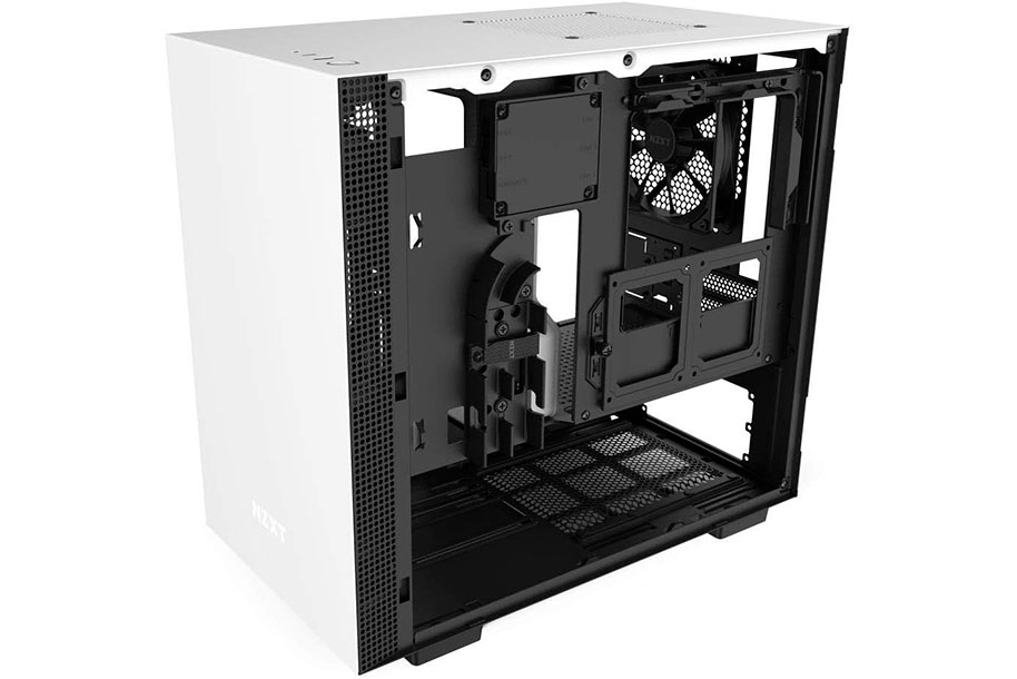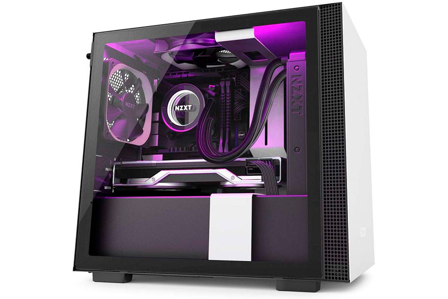 The compact H210i is a slim 27-liter mini-ITX case with a suite of builder-friendly features. From the full tempered glass panel to the front panel USB-C connector, removable radiator mounting bracket, and patented cable management system, your build will be both easy and beautiful. Its small size still allows for radiators up to 240mm, and both SFX and ATX power supplies, so you can choose your components without compromise. The H210i includes the NZXT Smart Device v2, powering the built-in RGB light strips and case fans.