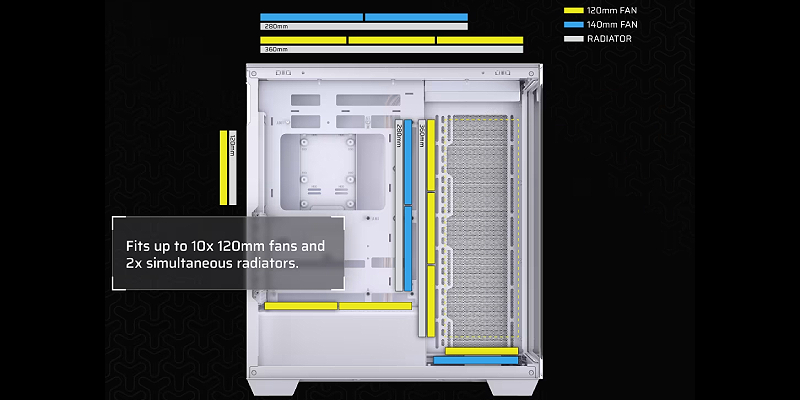 התאם אישית את מערך הקירור שלך עם מקום ל-10 מאווררים בגודל של עד 120 מ"מ, בתוספת אפשרויות מגוונות להרכבה של רדיאטור עד 360 מ"מ בצד ובגג.