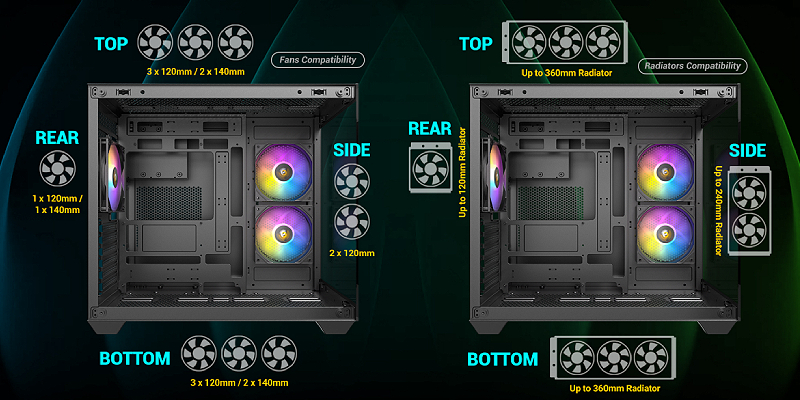 תומך בהתקנה בו־זמנית של רדיאטור עליון 360 מ"מ, רדיאטור תחתון 360 מ"מ, ורדיאטור צדדי 240 מ"מ.