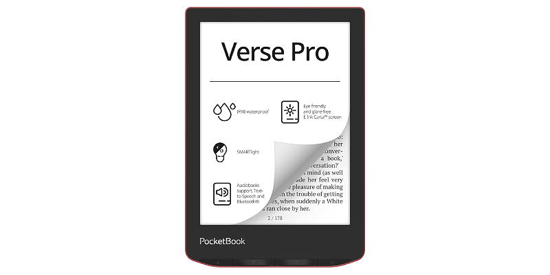 ספר אלקטרוני Verse Pro PB634-3-WW מבית PocketBook בצבע אדום, עם מסך בגודל 6 אינץ', Bluetooth, תכונת SMARTlight להתאמת גוון חם או קר, תכונת Text-to-Speech, עמידות במים בתקן IPX8 וחיבור Wi-Fi. תמיכה בשפות - עברית / אנגלית / ערבית / רוסית / אוקראינית.