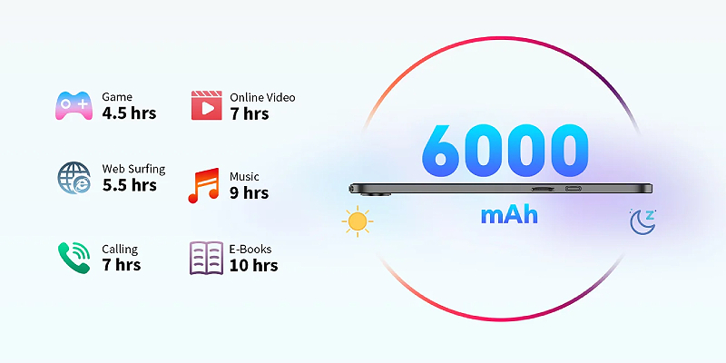 סוללה עוצמתית של 6000mAh בשילוב מעבד חסכוני – מאפשרים צפייה של עד 7 שעות.