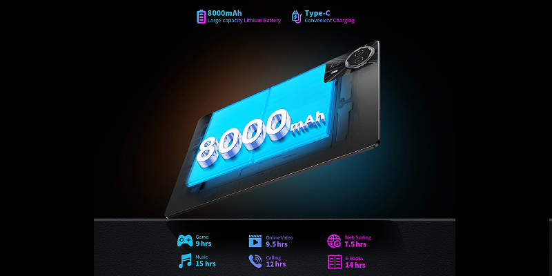 הטאבלט Teclast T50 Plus כולל סוללת ליתיום חזקה בקיבולת של 8000mAh, המתאימה במיוחד לעבודה ממושכת ולשעות של הנאה ובידור.