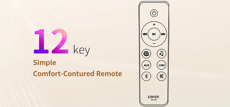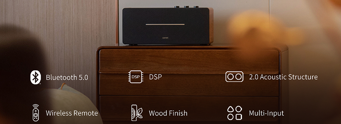 רמקול סטריאו משולב עם Bluetooth 5.0, כניסות RCA ו-AUX, שלט רחוק וכפתורי שליטה בחלקו העליון.