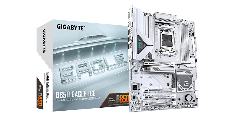 לוח אם B850 EAGLE ICE מבית Gigabyte, עם זיכרון v-color Manta XSky RGB DDR5 6000 CL30 White בנפח 32GB (2x16GB) ודיסק Gigabyte AORUS 7000E M.2 MVMe Gen4 SSD בנפח 1TB.