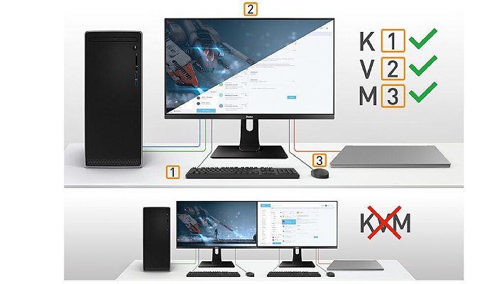 מסך עם מתג KVM מאפשר לך לשתף את ההתקנים המחוברים באמצעות USB למסך שלך יחד עם שני מחשבים שונים.
