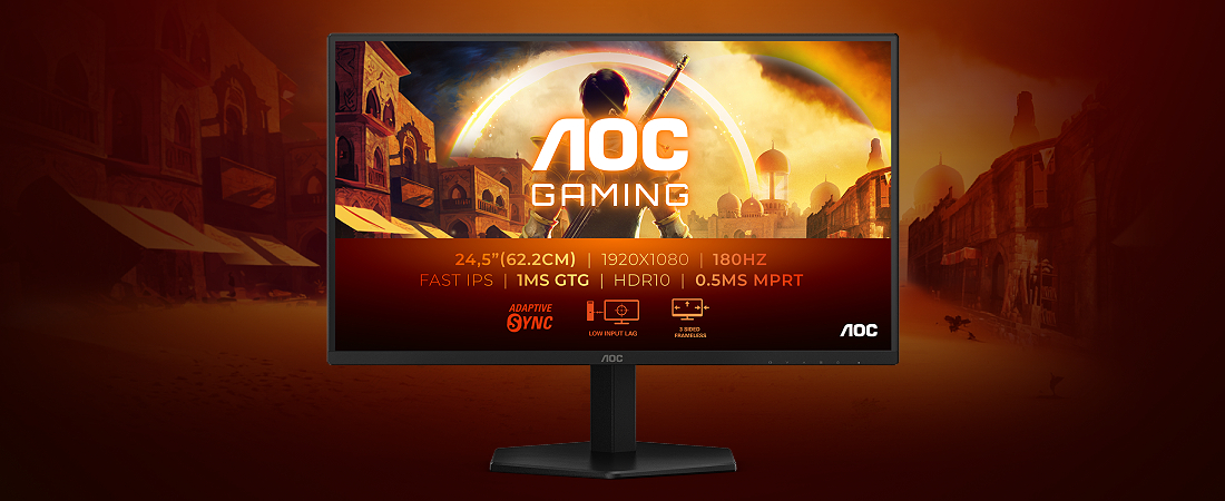 מסך 25G42E בגודל 24.5 אינץ', ברזולוציית Full HD (1920x1080) וקצב ריענון חלק במיוחד של 180Hz המספק תנועה זורמת וחדה בכל משחק.