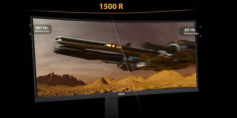 TUF Gaming VG34VQL3A מציע תצוגה מרהיבה מכל הזוויות עם קימור של 1500R, שמבטיח שכל נקודה תהיה במרחק אחיד מהעיניים שלך.