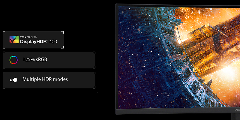 TUF Gaming VG34VQL3A מנצל את טכנולוגיית HDR כדי לספק צבעים חדים יותר ורמות ניגודיות גבוהות יותר בהשוואה למסכים מסורתיים.