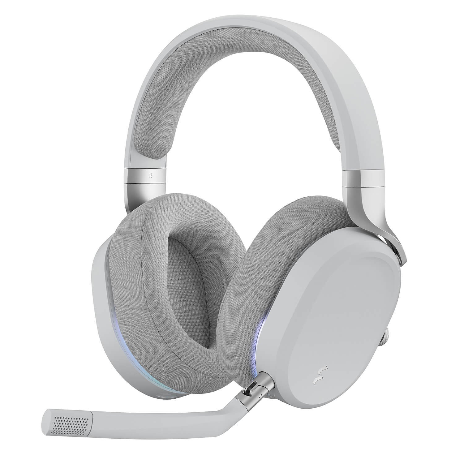 אוזניות קשת אלחוטיות לגיימינג Scape Light מבית Fractal Design, בצבע לבן, עם שמע בהשהיה (latency) אולטרה-נמוכה, פרופילי EQ מותאמים אישית, חיבור באמצעות Bluetooth או 2.4GHz אלחוטי, מיקרופון ניתן לניתוק, חיי סוללה של עד 40 שעות ומעמד טעינה אלחוטית. FD-HS-SCA1-02