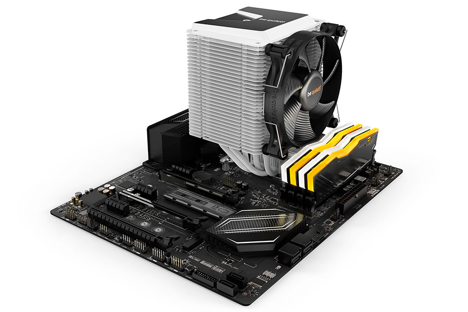 The Shadow Rock 3 can be installed on all popular motherboards and its asymmetrical construction saves a lot of space. The memory slots in front of the cooler will not be blocked.