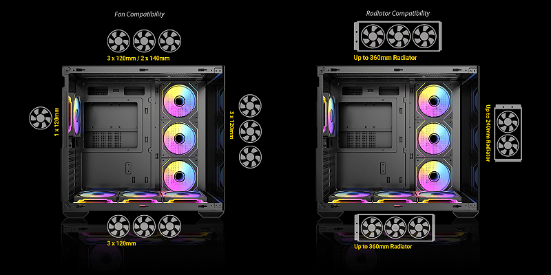 תומך ברדיאטורים של 360 מ״מ בחלק העליון והתחתון, וברדיאטור 240 מ״מ בצד – להתאמה למגוון תצורות קירור.