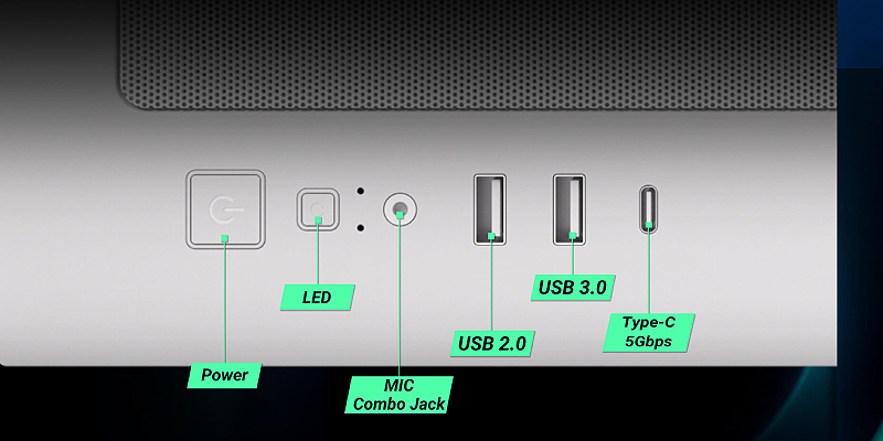 כפתור הפעלה, כפתור שליטה בתאורת LED, שקע אוזניות/מיקרופון משולב, USB 2.0 ×1, USB 3.0 ×1, Type-C 3.2 Gen 1 (5Gbps) ×1.