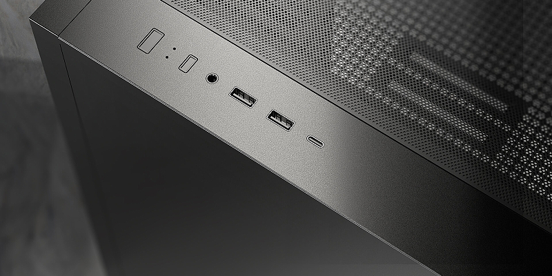 כפתור הפעלה, איפוס, שקע אוזניות/מיקרופון משולב, 2 × USB 3.0, ו-Type-C 3.2 Gen 2 (10Gbps).
