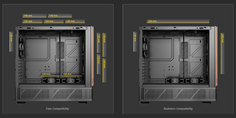 2 × מאווררי PWM בגודל 140 מ״מ בחזית, 2 × מאווררי PWM הפוכים בגודל 120 מ״מ מעל תא ספק הכוח, 1 × מאוורר PWM בגודל 120 מ״מ מאחור.