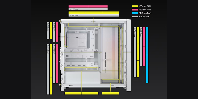 התאם אישית את מערך הקירור שלך עם מקום לעד 13 מאווררים בגודל 120 מ"מ, וכן אפשרויות התקנת רדיאטורים גמישות, כולל התקנה של שני רדיאטורים בגודל 360 מ"מ.
