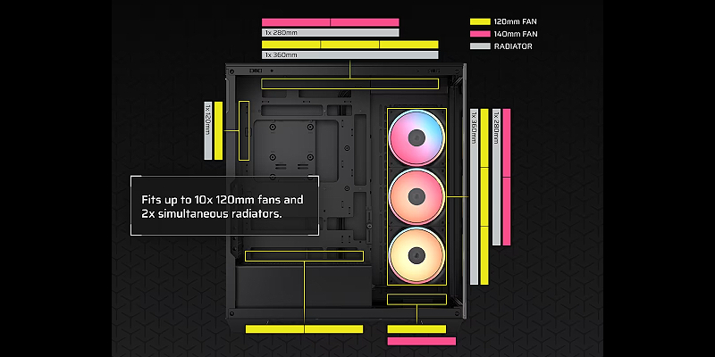 התאם אישית את מערך הקירור שלך עם מקום לעד 10 מאווררים בגודל 120 מ"מ, וכן אפשרויות התקנת רדיאטורים גמישות, כולל עד 360 מ"מ בצד ובגג.