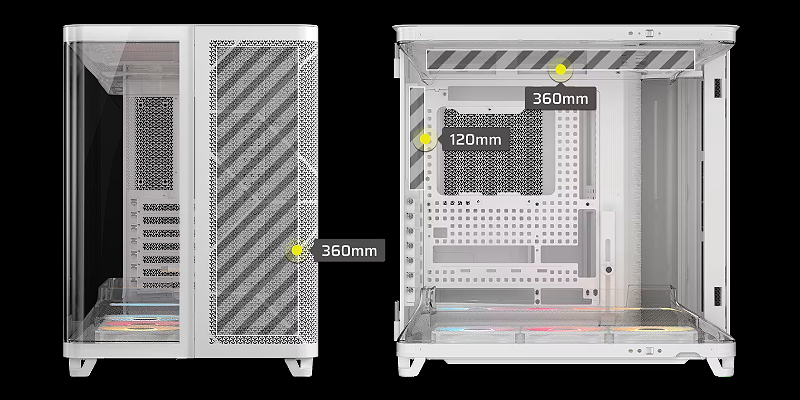 אפשרות להתקנת רדיאטור 360 מ״מ או 240 מ״מ מלפנים, ועוד רדיאטור 360 מ״מ או 240 מ״מ בחלק העליון או התחתון.