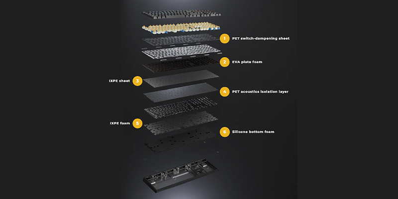 שבע שכבות שיכוך יחד עם מבנה Gasket-Mount מספקות צליל נקי ומאוזן לכל מתג.