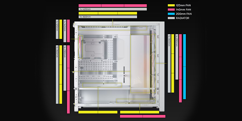 שפרו את הקירור עם שלוש עמדות להתקנת רדיאטורים – עד 420 מ"מ בגג, ו־360 מ"מ בקדמת ובצד המארז.