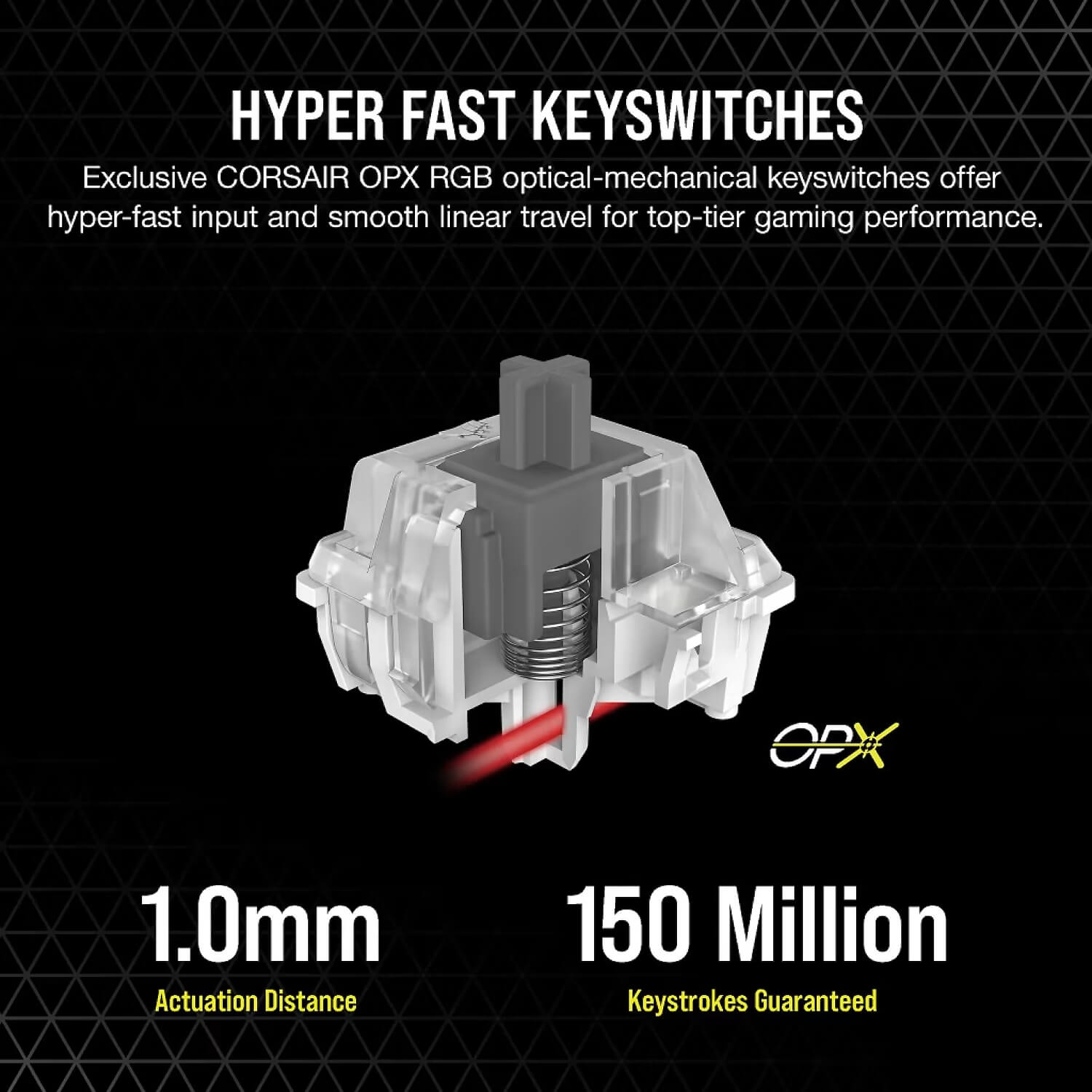 קלט מהיר במיוחד עם טווח לחיצה של 1.0 מ"מ ותנועה ליניארית חלקה, לחיצות המקשים נקלטות עד פי 8 מהר יותר ממקלדות גיימינג מכניות סטנדרטיות עם CORSAIR AXON.