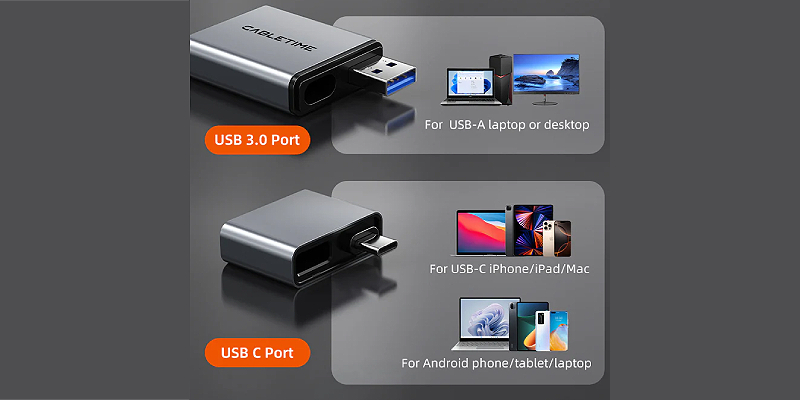 העבר קבצים בשניות עם קורא כרטיסים USB A ו-USB Type C זה.
