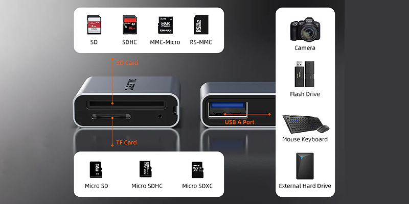 מצויד בחיבורי SD, MicroSD ו-USB-A, והוא תומך במגוון פורמטים של כרטיסים, כולל MicroSDHC, SDXC ועוד.